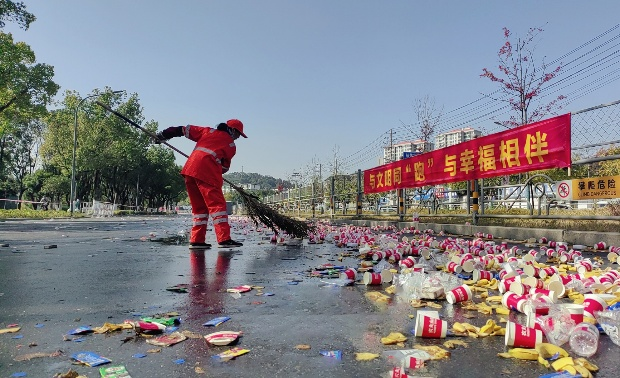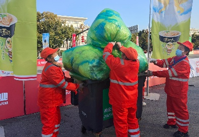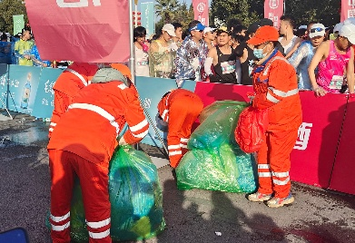 賽事結(jié)束后,項目團隊立即轉(zhuǎn)入賽后恢復(fù)作業(yè)模式,迅速開啟“人機”協(xié)同,對賽道沿線遺留的紙杯、包裝物等賽事垃圾進行集中清理、分類轉(zhuǎn)運。累計清理200余處衛(wèi)生死角,清運賽事垃圾約30余噸,并在1小時內(nèi)還原道路潔凈,以最快速度使城市環(huán)境與秩序回歸常態(tài)。